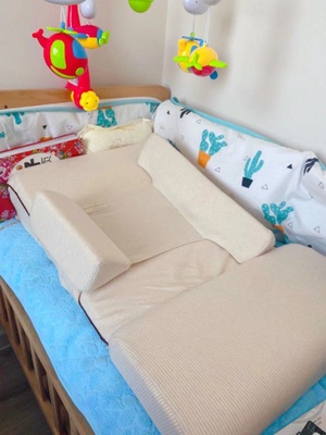 + Gối cho bé bú. Nếu bé bú bình, mẹ đặt bé nằm trên gối ở vị trí có độ nghiêng cao nhất và tiến hành cho bé bú. Nếu bé bú mẹ, mẹ hãy tháo chặn ra và điều chỉnh vị trí nằm của bé sao cho khi mẹ nằm cạnh bé thì miệng bé sát bầu ngực nhất.