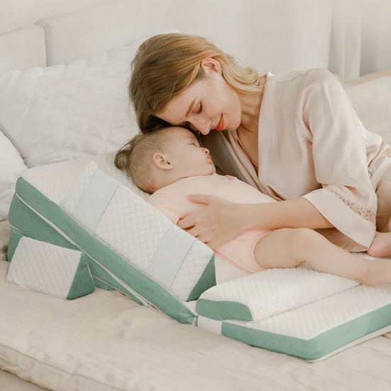 + Gối cho bé bú: Nâng cao gối đến độ nghiêng 30 độ, giúp việc cho bé bú dễ dàng ngay với cả các bé bị trào ngược.