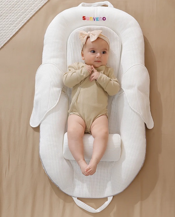 + Đai an toàn: Thiết kế đôi cánh ở hai bên giường của gối giống như bàn tay của mẹ nhẹ nhàng ôm bé vào lòng, xoa dịu cảm xúc của bé, cho bé cảm giác an toàn, tránh bị giật mình đột ngột khi ngủ , và để bé ngủ yên bình hơn